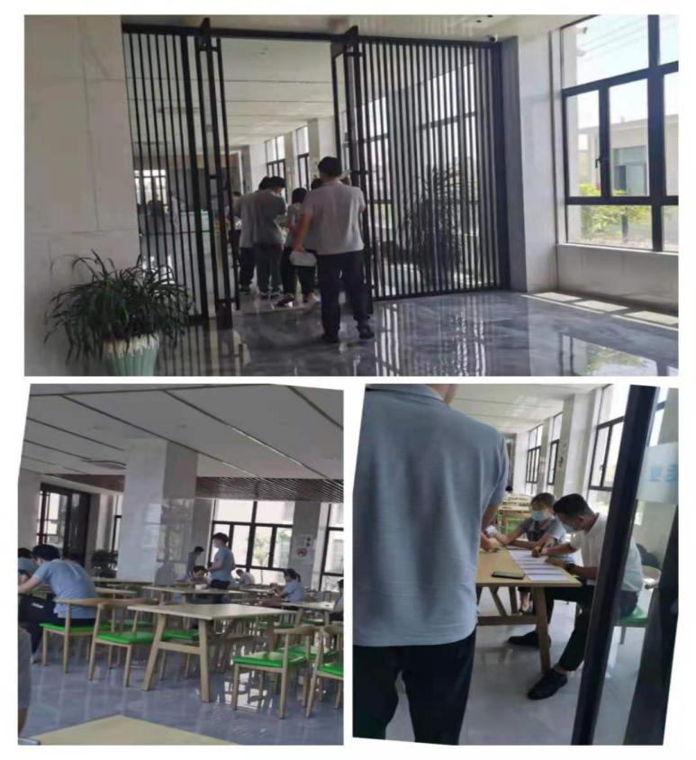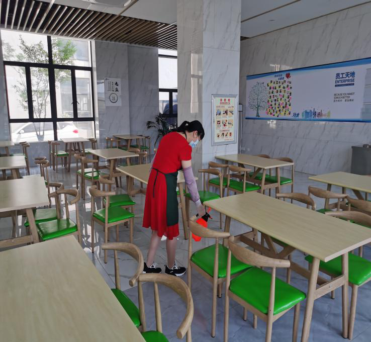 中午公司食堂就餐,安排餐前測(cè)溫,就餐期間一人一桌,不交流拉開(kāi)吃飯的距離減少感染的機(jī)會(huì)。就餐結(jié)束,每位員工的餐盤(pán)自行帶回清洗消毒保管。